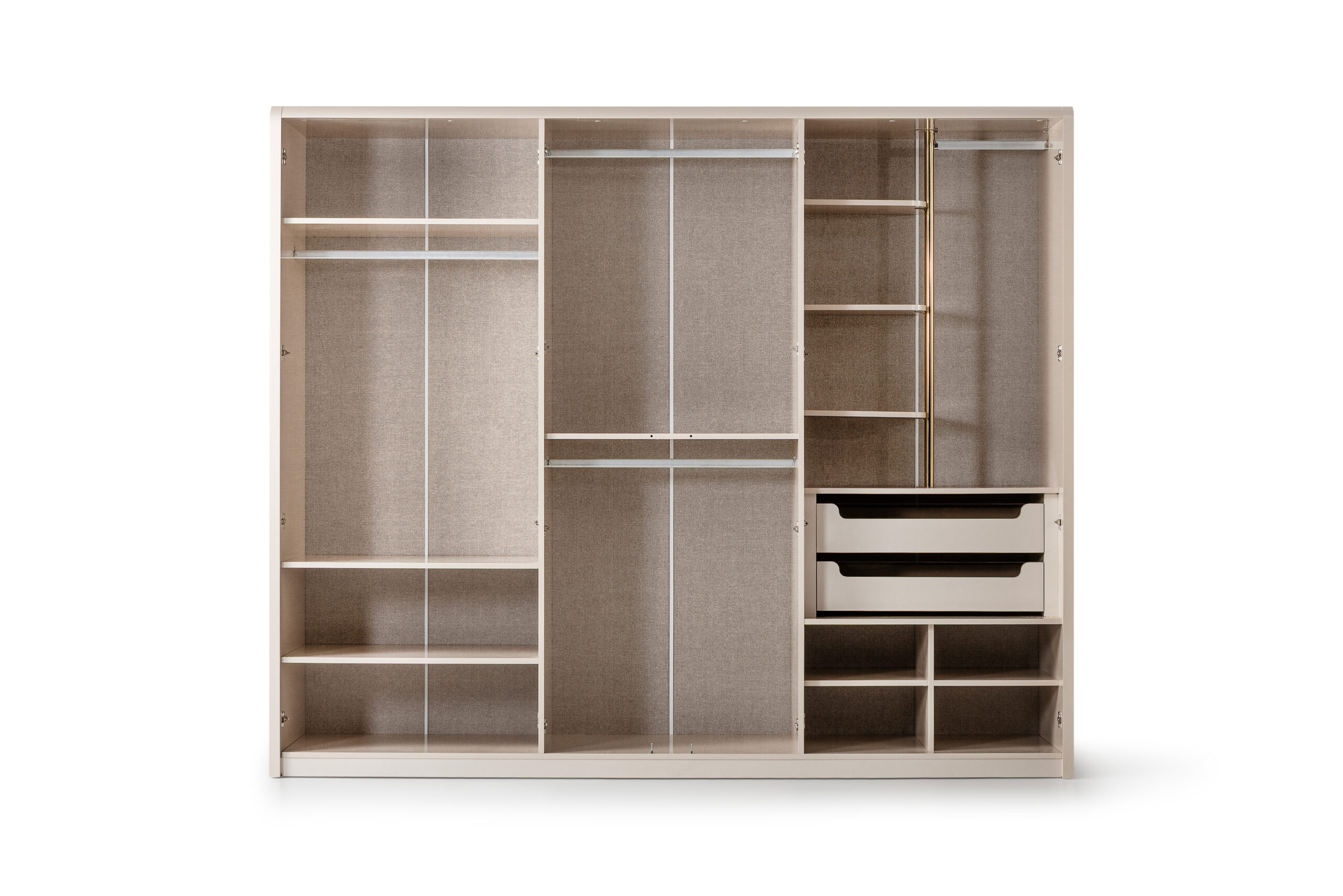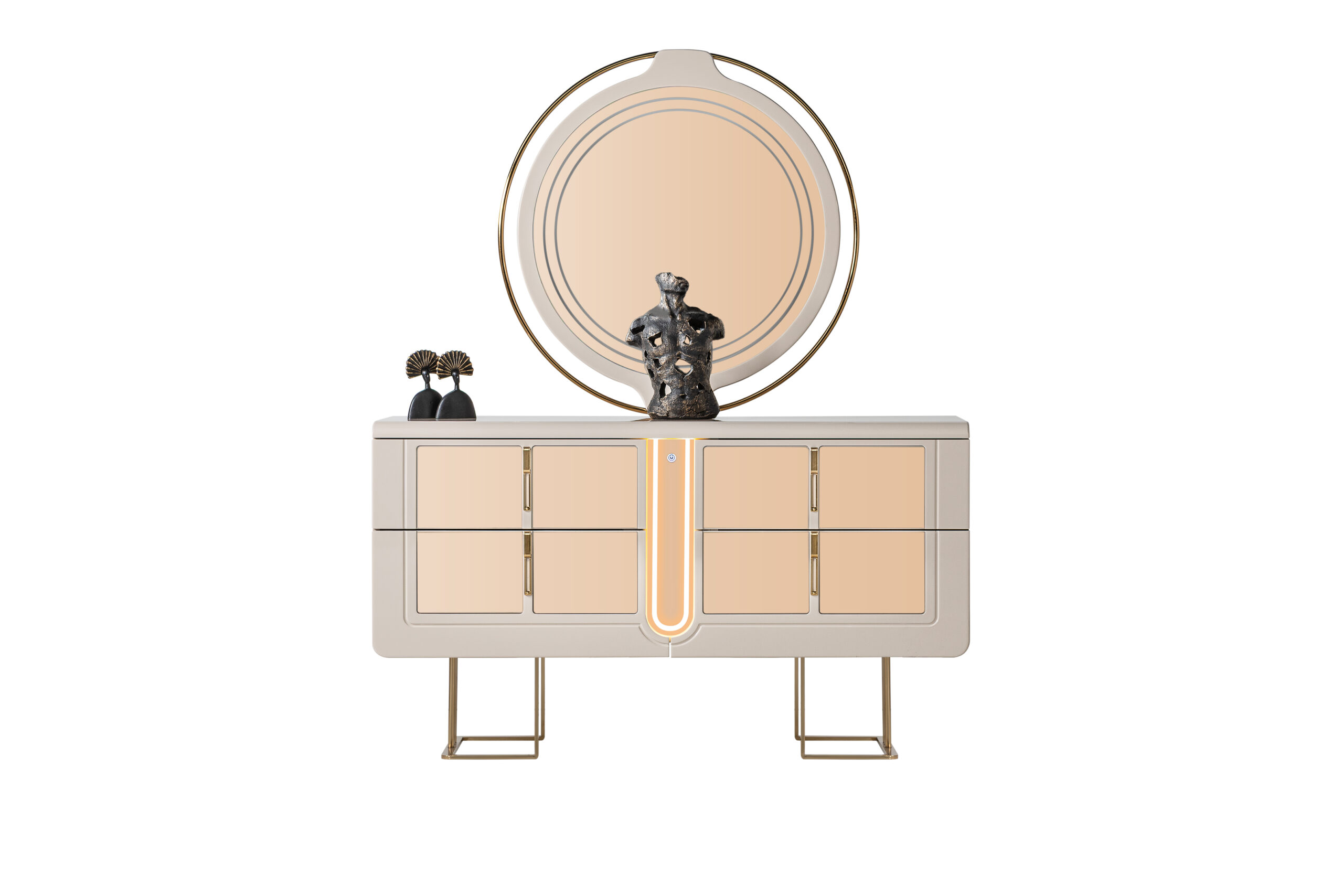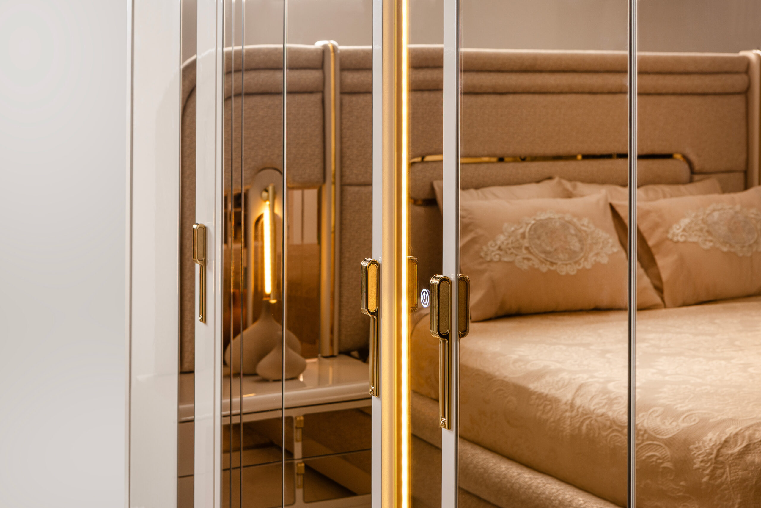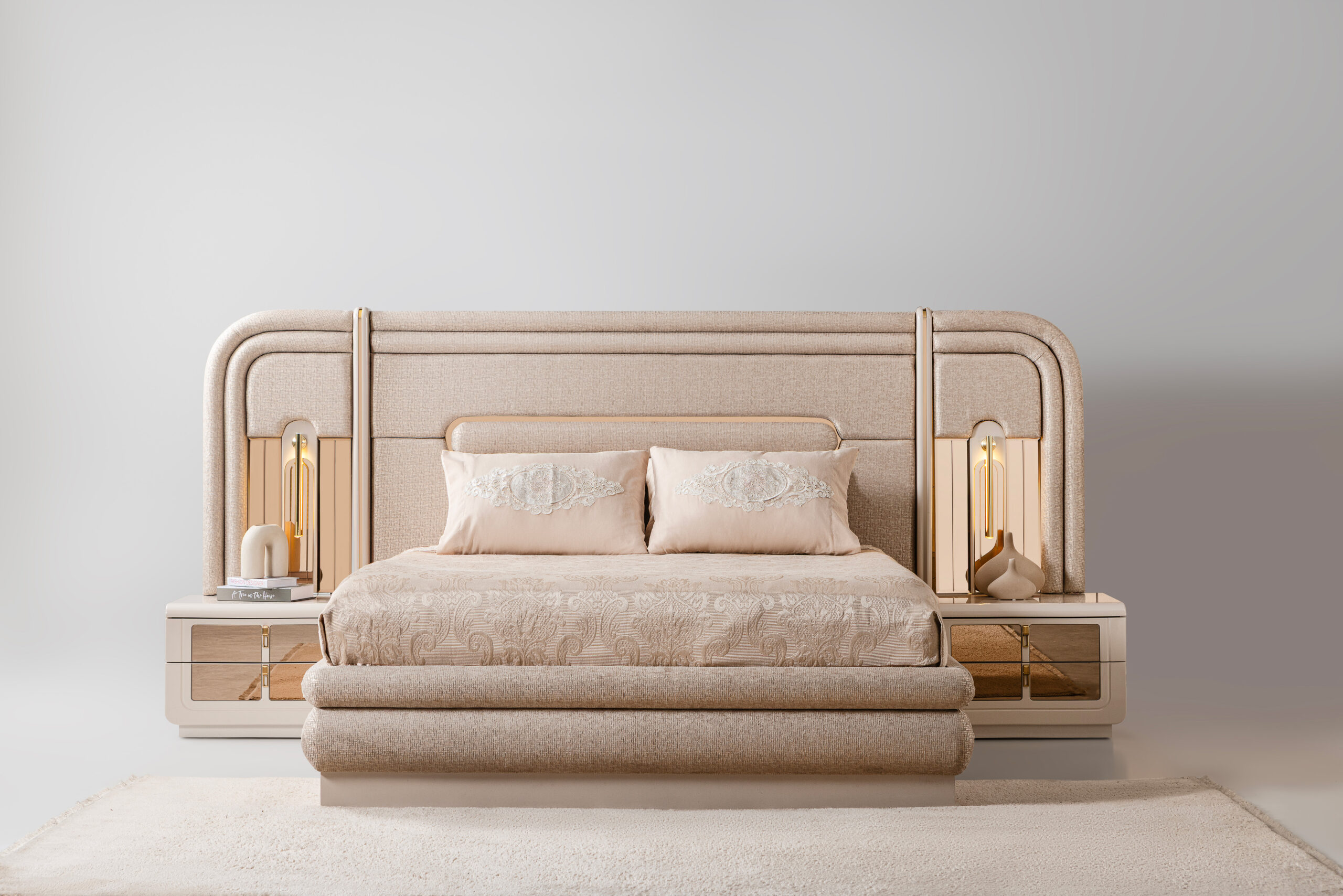 The statement headboard, upholstered in rich textured fabric, features layered cushioning and vertical golden accents that introduce a touch of opulence without overwhelming the space. The bed’s elegant profile is complemented by its harmoniously crafted nightstands, each adorned with polished gold hardware and clean lines that elevate the room’s aesthetic with subtle glamour